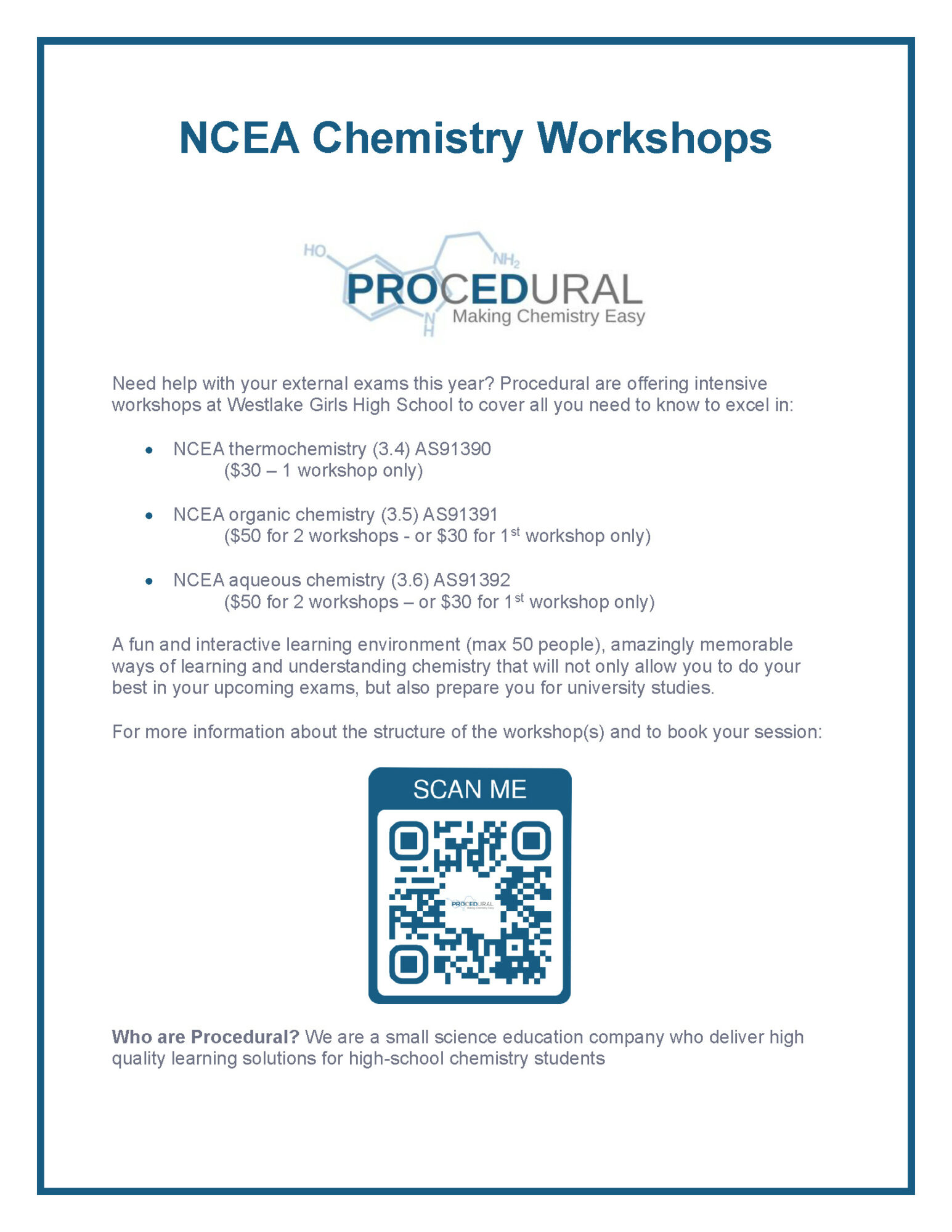 WGHS have the pleasure of hosting the first-ever Level 3 Chemistry tutorial sessions. These will be held over the 2 weeks of the September break and will cover the 3 external achievement standards.