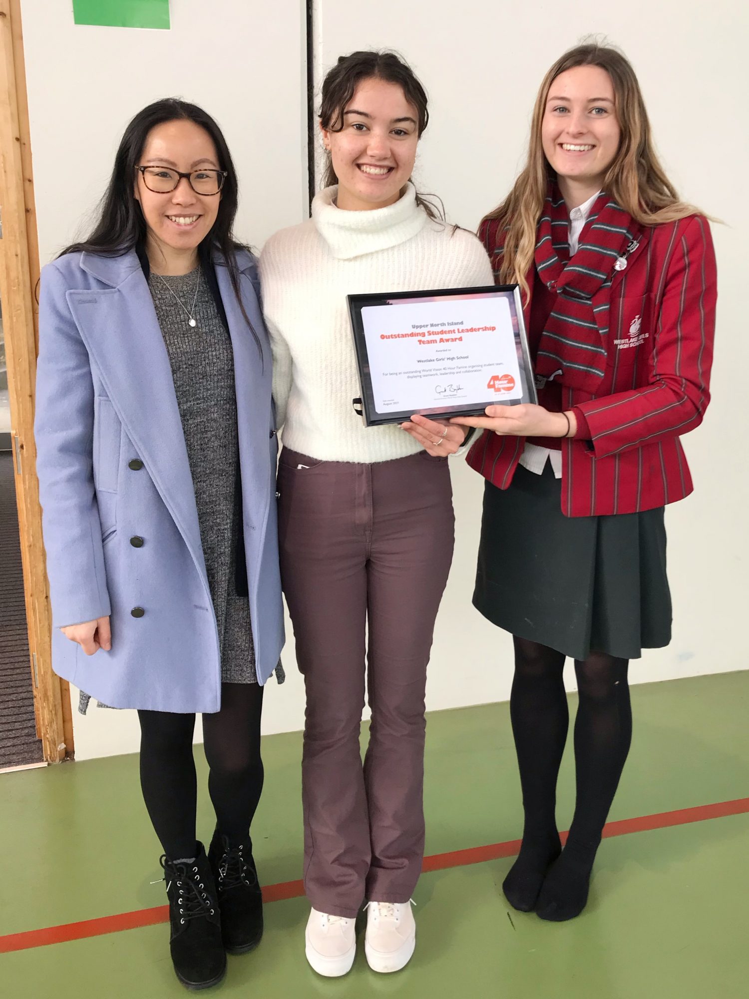 Sarah (left) is pictured with Alyssa Wilson (centre) and teacher Emily Tsang who looks after the World Vision group at Westlake.