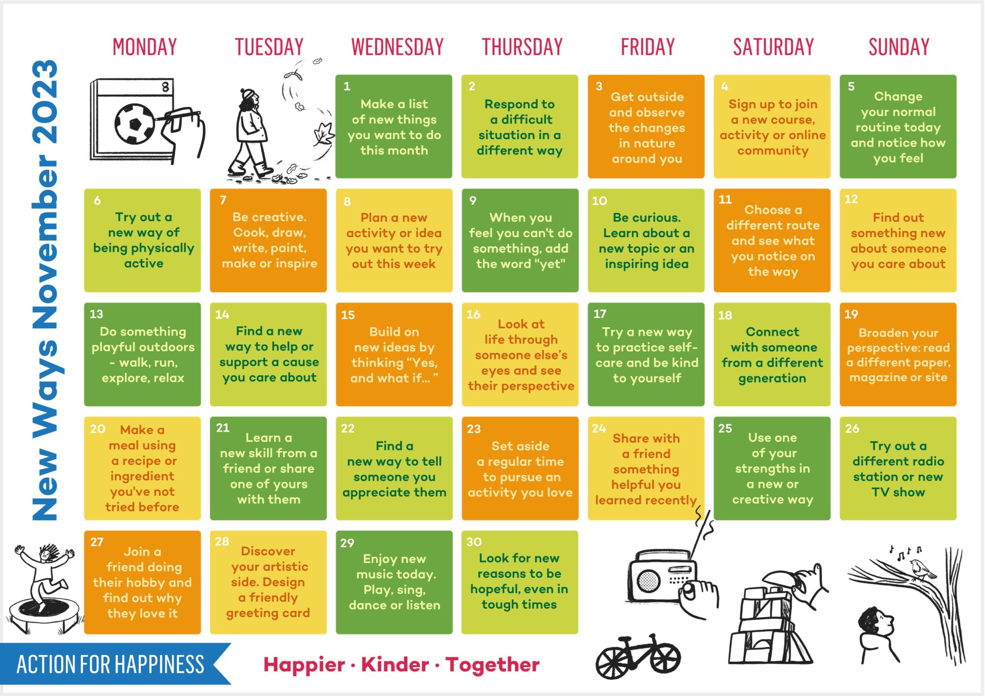Did you know that trying something new can be an instant mood booster? Here’s a cute little calendar of small, easy things to try each day this month.